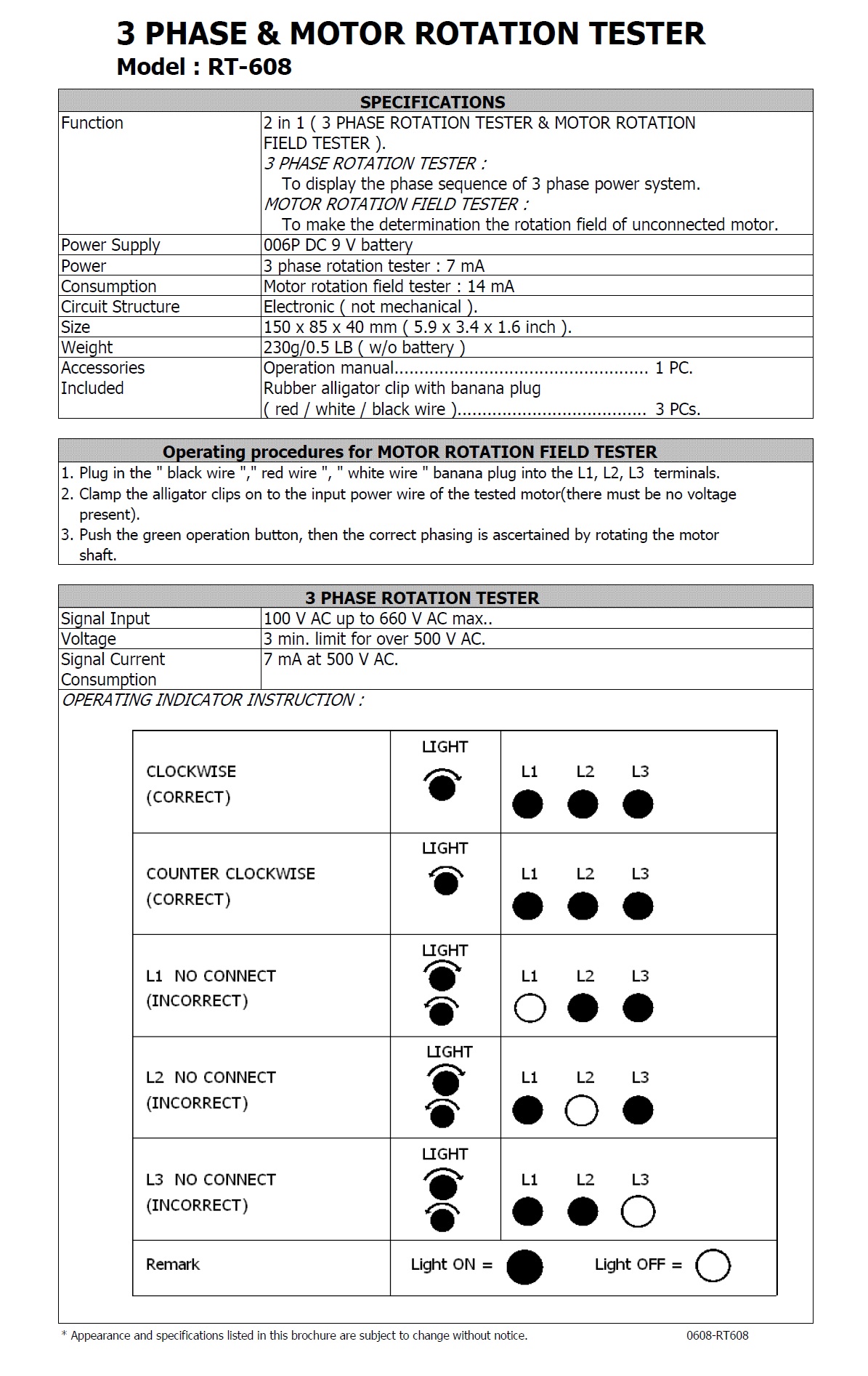 3 PHASE & MOTOR ROTATION TESTER - RT-608   三相電源/馬達檢相器