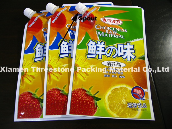 Feautre:1) colorful printing are available, up to 8 spot color, gravure printing; 2) smell proof, to keep food fresh; 3) bottom gusset, free standing; 4) with spout fill liquid in, 5) spout can be customize to fit different machine