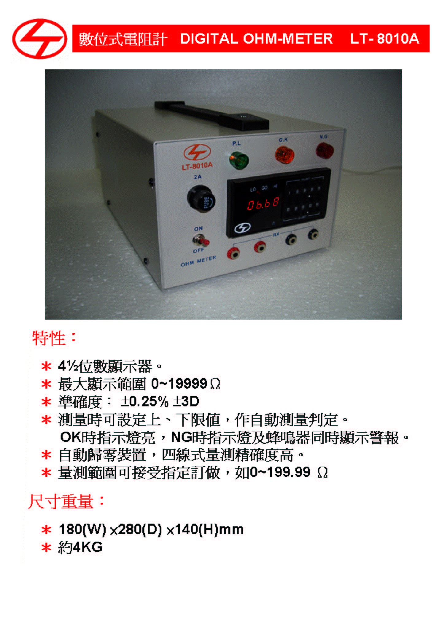 Product Name : | 數位式電阻器 Digital OHM Meter - LT-8010A |