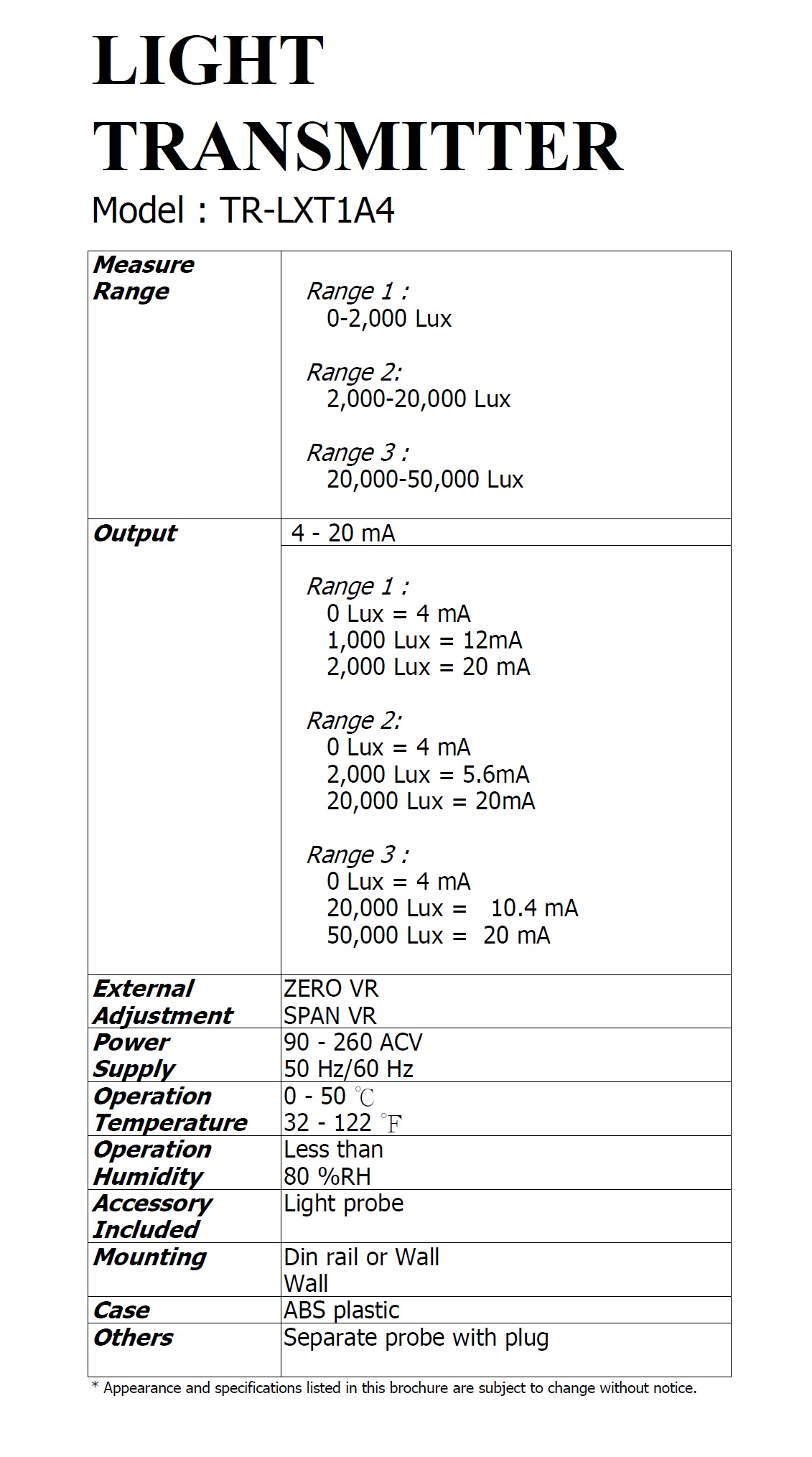 Product Name : | LIGHT TRANSMITTER - TR-LXT1A4 照度傳送器 |