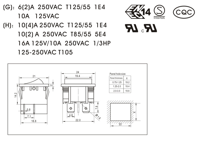 (G): 6(2)A 250VAC T125/55 1E4