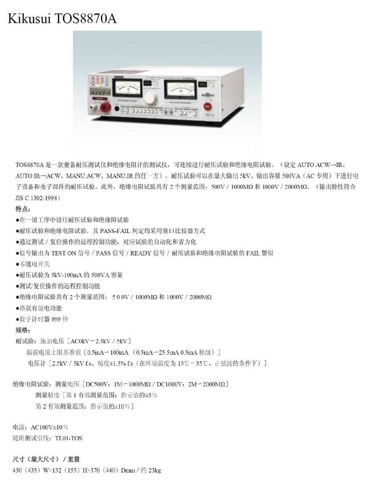 型号            TOS-8870A 耐压绝缘测试仪