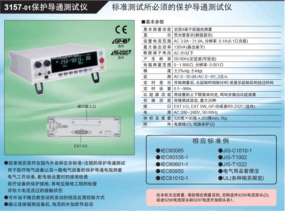 简单地实现符合日本国内外各种安全标准·法规的保护导通测试用于医疗电气设备以及一般电气设备的保护导通电阻测量电气工作设备、配电板设置时的接地检查医疗设备的保护接地、等电位接地工程的检查评估大电流流过的接触状态
