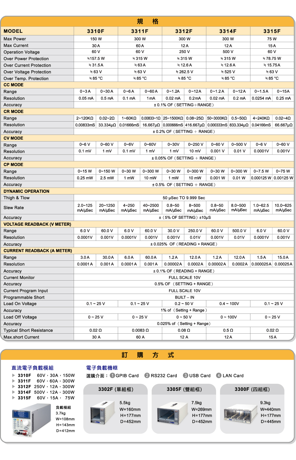 • 每個3310F系列模組均有獨立的控制及顯示面板、定電流/定電阻/定電壓/定功率/動態模式,配合3300F機框上的150組 儲存/呼叫 記憶,能有效地控制所有負載的設定,更可透過RS232、Ethernet、USB和GPIB等介面進行遠端控制。