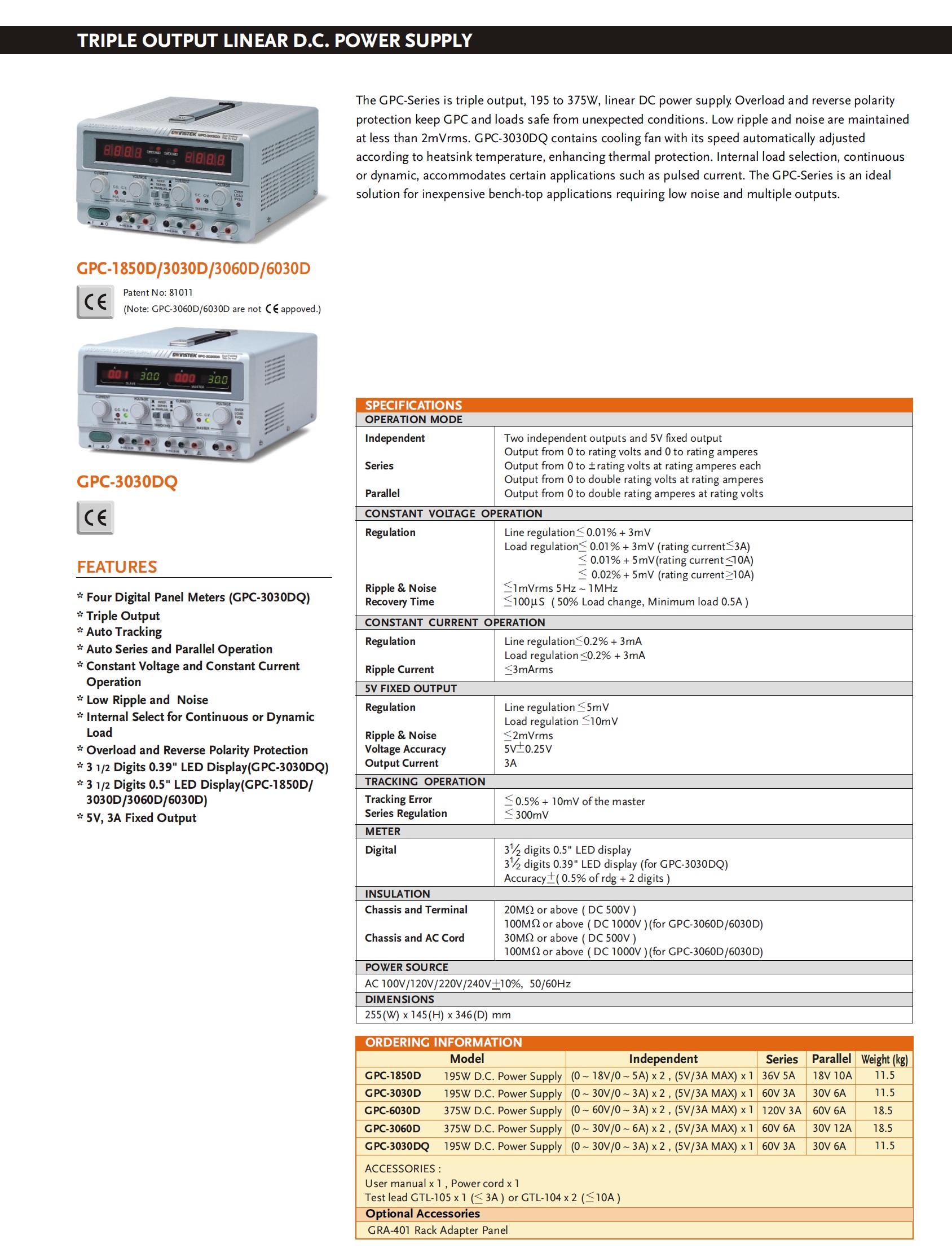 GPC系列是三通道輸出,135W到195W的線性直流電源。過載和極性反向保 護功能可以使電源和負載免受意外的損壞。漣波和雜訊小於2mVrms。GPC-3030DQ的智能型風扇根據溫度來自動調節其轉速,增強溫度保護。內部選 擇連續或動態負載適合於脈衝電流應用場合。GPC系列輕薄短小,攜帶方便,價格適中,是要求低雜訊和多輸出組合的理想選擇。