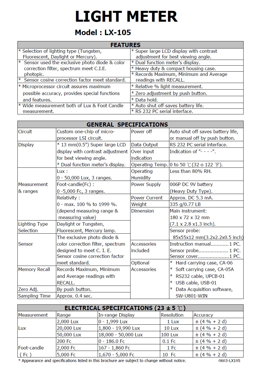 Product Name : LIGHT METER - LX-105 智慧型數字照度計